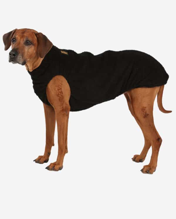 Hundebademantel mit Stehkragen aus Frottee nach Maß – souverän in Material, Schnitt und Funktion für große, mittlere und kleine Hunde. Ein großschlingiger Baumwollfrottee sorgt dafür, dass Feuchtigkeit nach der notwendigen Dusche oder dem Bad im Naturgewässer schnell aufgenommen, aber auch ebenso schnell wieder abgegeben werden kann. Feuchte Sofas und Liegestellen gehören damit der Vergangenheit an. Außerdem kann dieses Modell neben Nässe reichlich Schmutz aufnehmen und binden. In der Funktion steht unser Hundebademantel nach Mass den Outdoor- Modellen in Nichts nach: Keine Schnüre, keine Schlaufen, keine Bänder oder anderes störendes Zubehör. Der perfekte Schnitt sowie der Reißverschluss auf dem Rücken mit einem großzügig gestalteten Untertritt sorgen für komfortables Anziehen und außergewöhnlich bequeme Trageeigenschaften. Für ein sauberes Auto nach dem Naturbad sowie ein schnelles „auf den Lieblingsplatz dürfen“ nach der heimischen notwendigen Dusche. Unser Bademantel ist für alle Hunderassen und Hundegrößen geeignet: Wellness für dich und deinen Hund!
